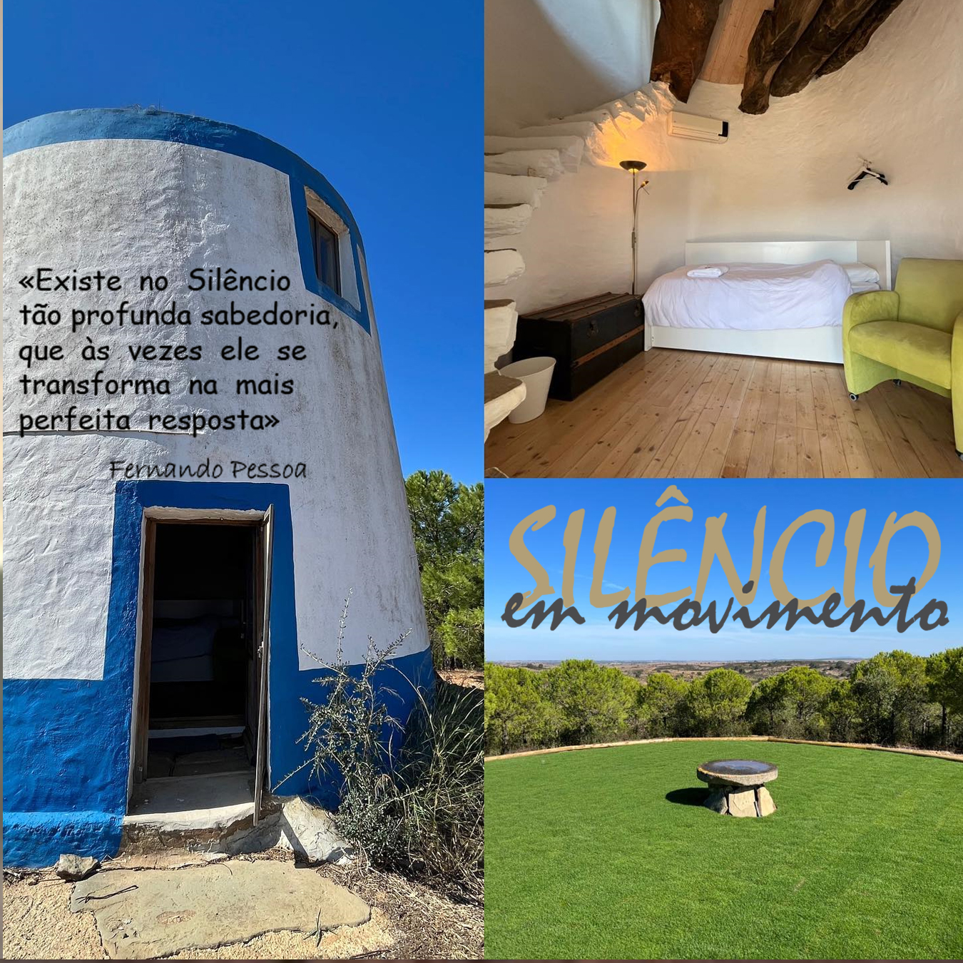 3 dias no Monte 3 Moinhos para redefinir, recarregar e reconectar. Tire 3 dias para treinar mente, corpo e espírito, cultivar o contentamento e sentir a natureza da tranquilidade Alentejana! Experimente a combinação transformadora de estar em silêncio com Práticas Ancestrais como Yoga, Qi Gong, Lu Jong, Tummo (aprenda como vai conseguir disfrutar de um saudável e energético banho frio), Risoterapia com seus movimentos, meditações e exercícios de respiração. Restabeleça uma vida saudável e significativa, uma dieta saudável e caminhadas na natureza.